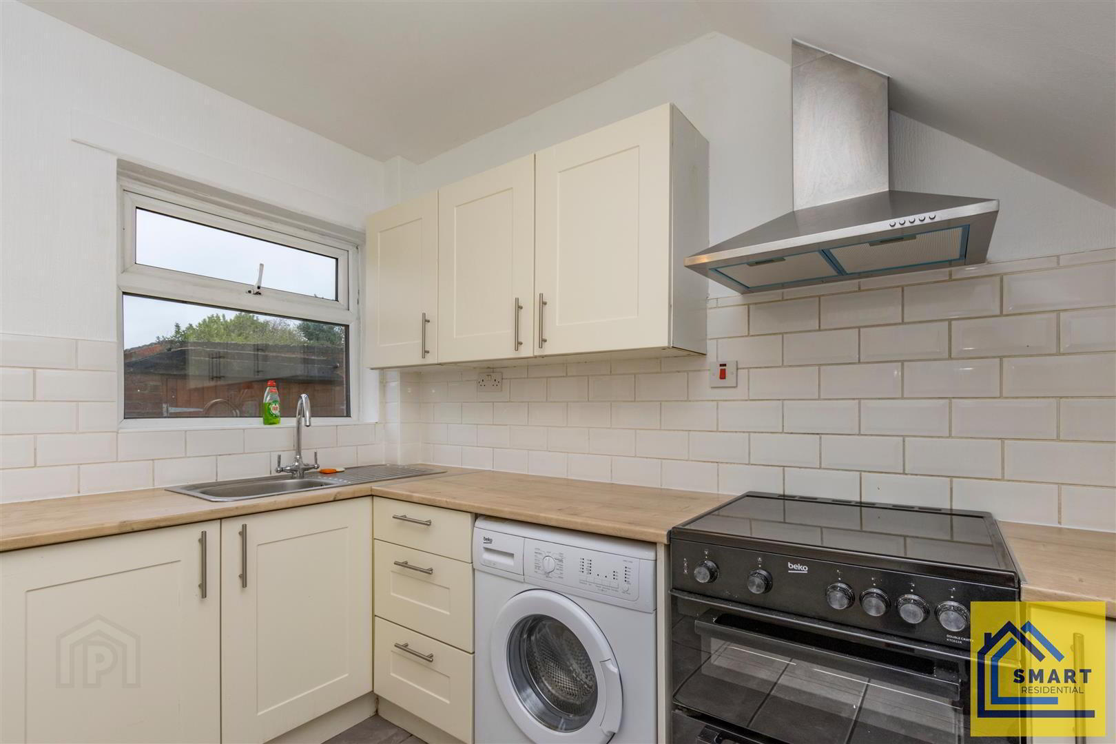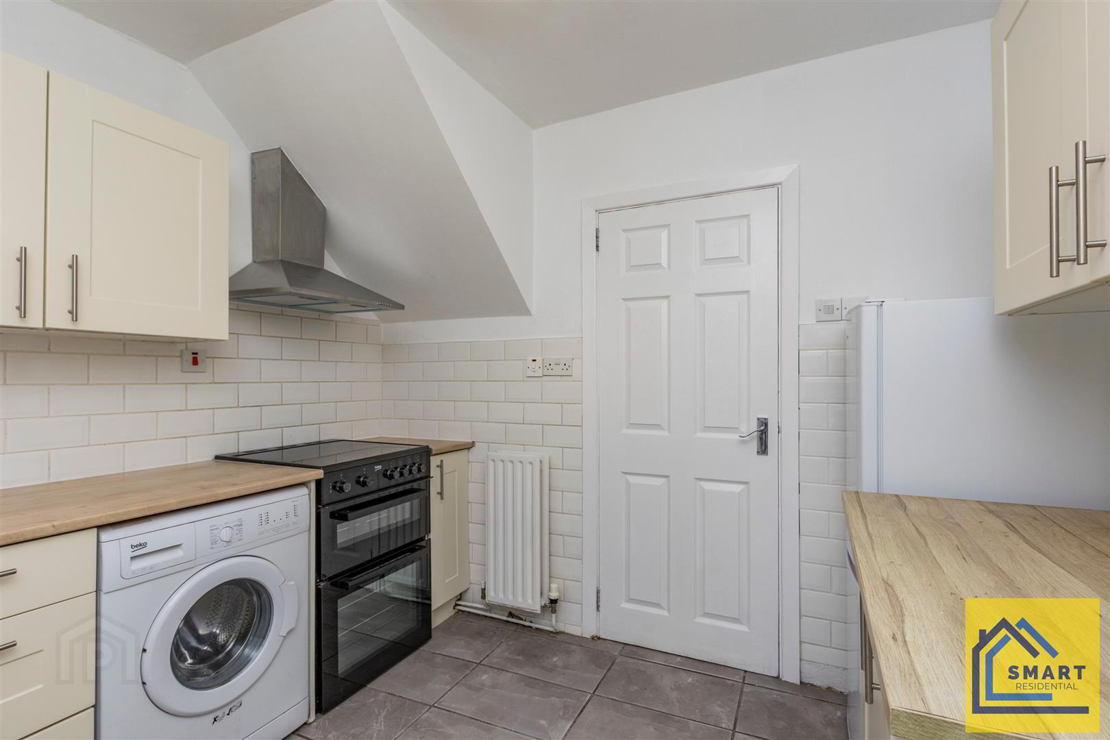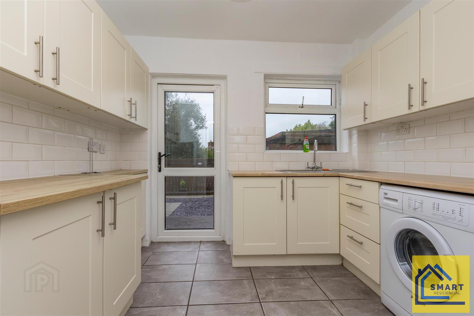 - Range of high and low level units, stainless steel sink unit with chrome mixer tap, space for cooker, space for fridge freezer, plumbed for washing machine. Tiled floor and part tiled walls.