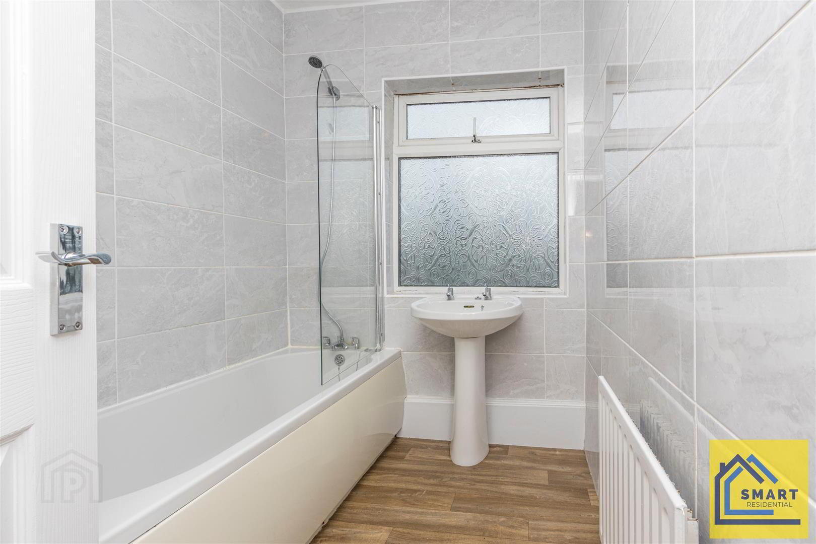 - Bathroom suite comprising pedestal wash hand basin with chrome taps and panel bath with telephone hand shower and glass shower screen. Linen cupboard. Fully tiled walls.