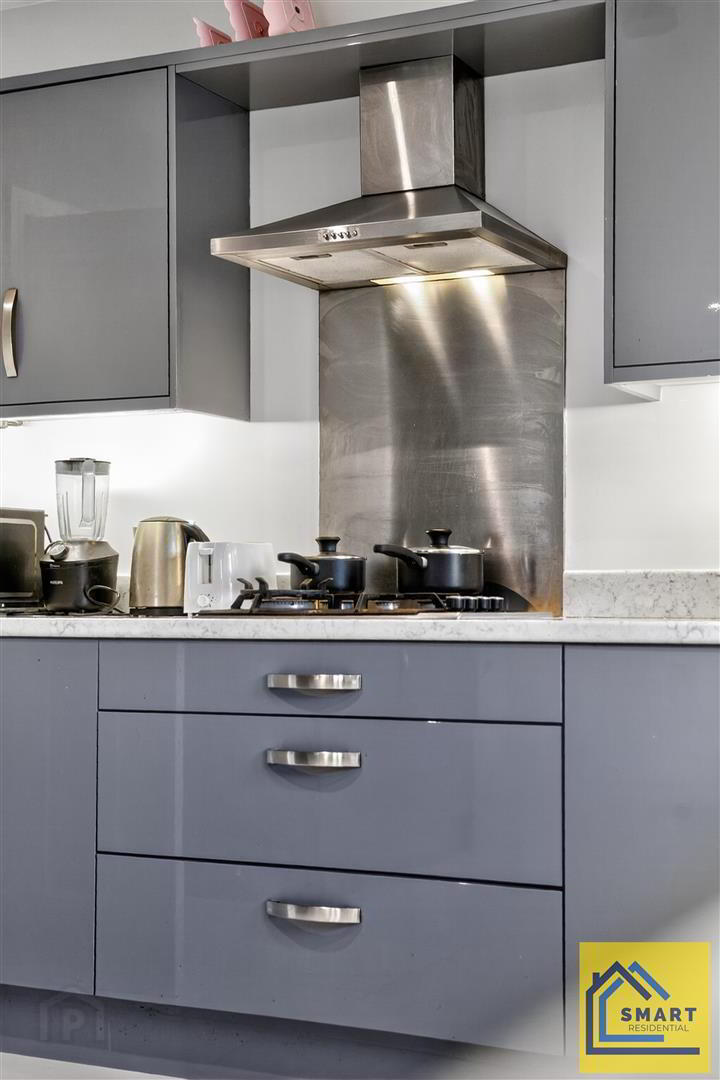 - Excellent range of high and low level units with stainless steel door furniture, laminated work surfaces, stainless steel one and half bowl sink unit with side drainer and chrome mixer taps. Four ring gas hob with stainless steel splash back and built in electric oven, stainless steel extractor fan, integrated dish washer, integrated fridge freezer. Recessed low voltage lights, and ceramic tiled floor.