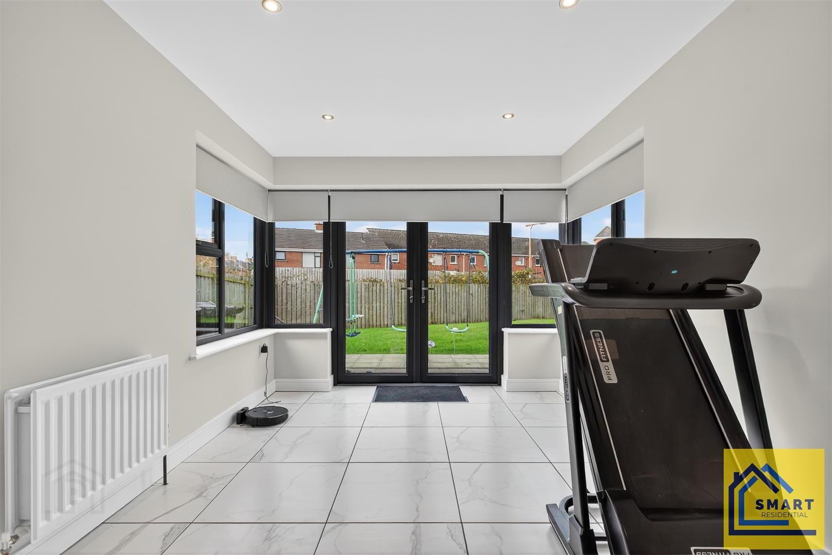- Recessed low voltage lights, upvc patio doors to rear garden, tiled floor
