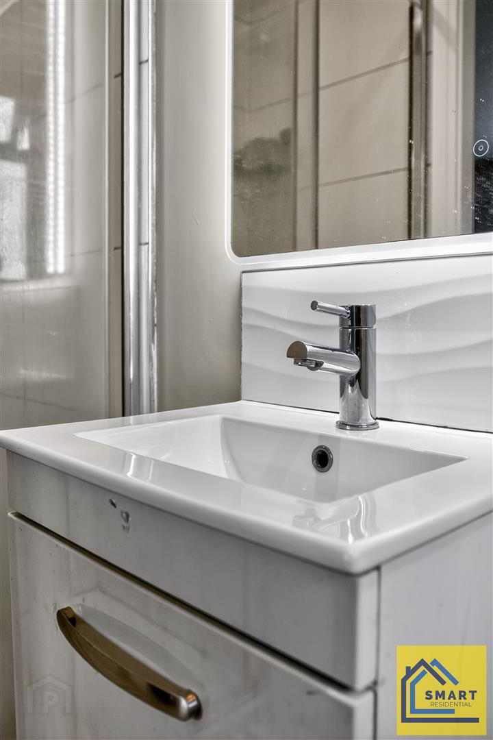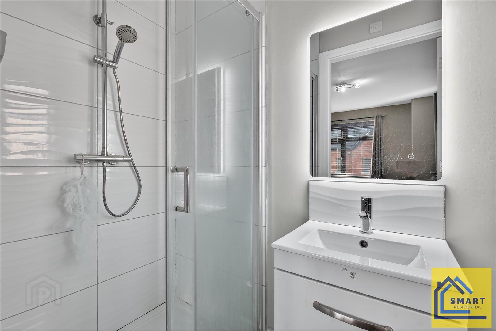 - Fully tiled shower cubicle with thermostatically controlled shower unit, Vanity unit with white sink and chrome mixer taps, low flush Wc, ceramic tiled floor