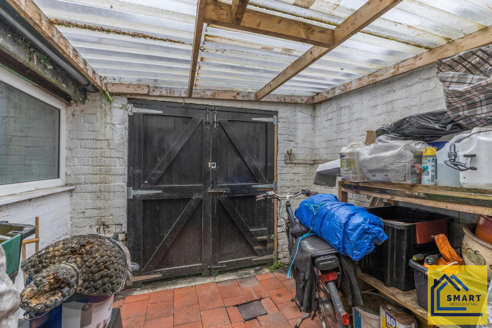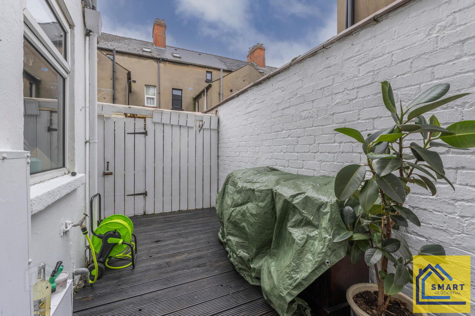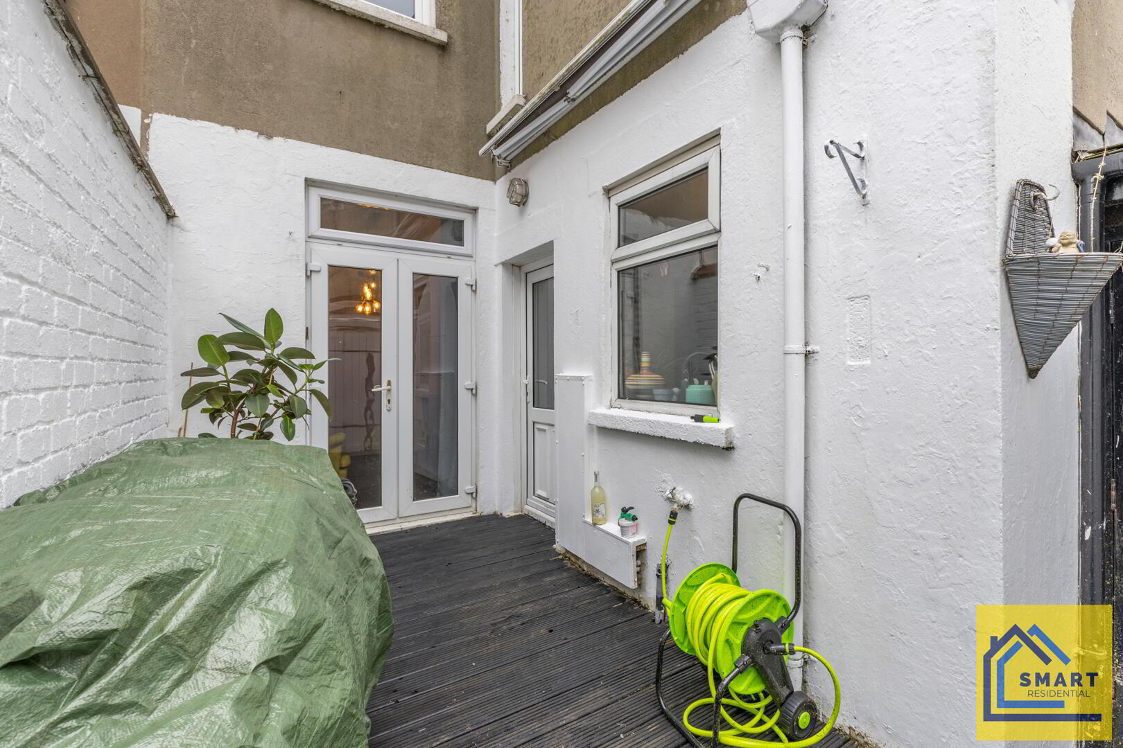 The rear courtyard offers a private outdoor space with decking and white-painted brick walls. It is accessed directly from the dining room and kitchen, providing a pleasant area for outdoor dining or relaxing with excellent storage and utility area