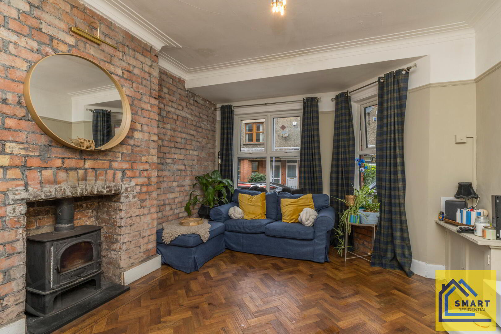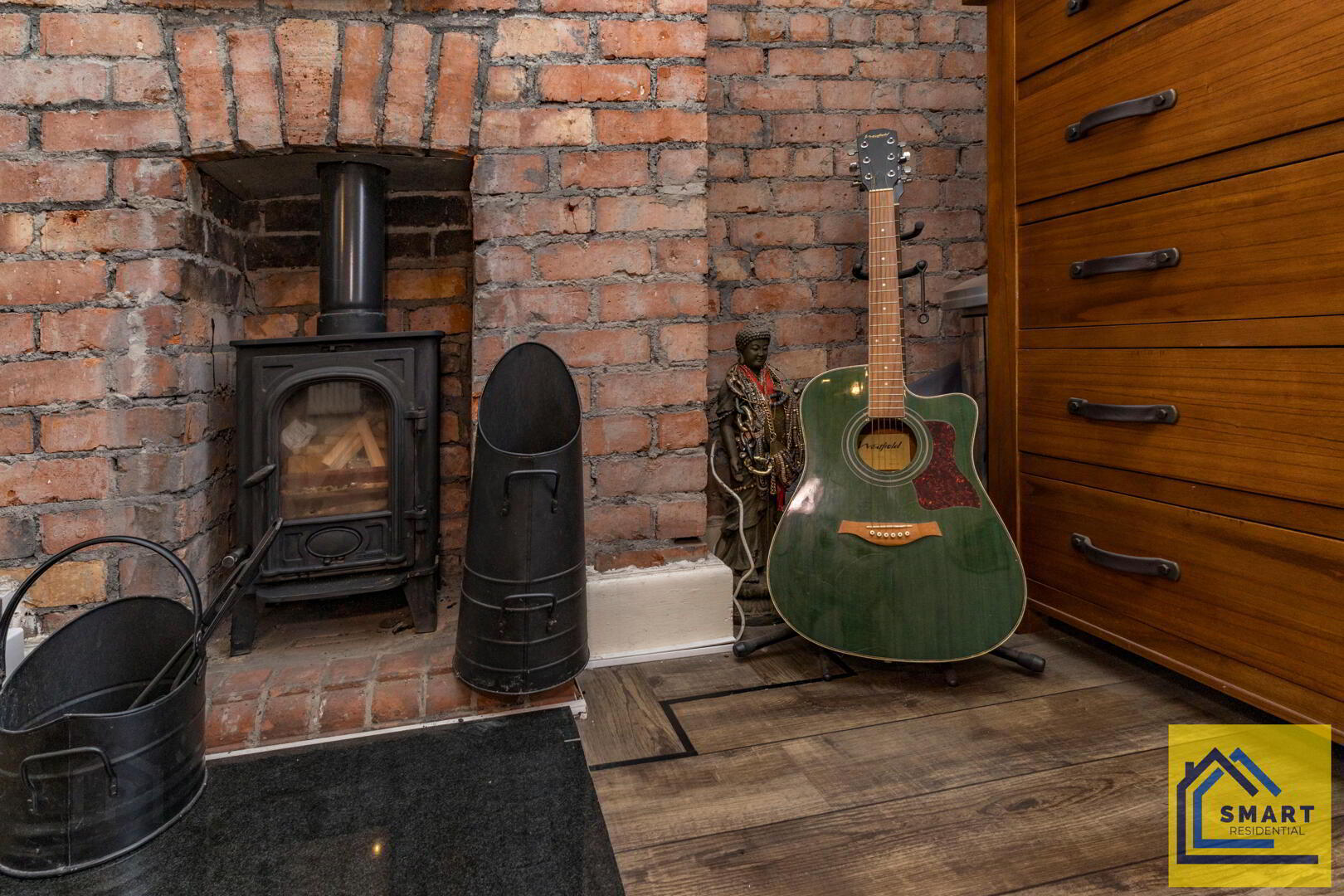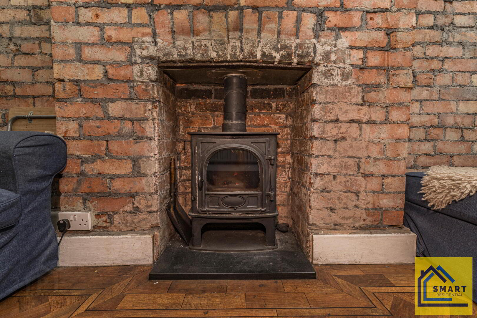 The living room offers an exposed brick chimney breast housing a traditional wood-burning stove. The room benefits from herringbone wood effect flooring and plenty of natural light through a bay window.