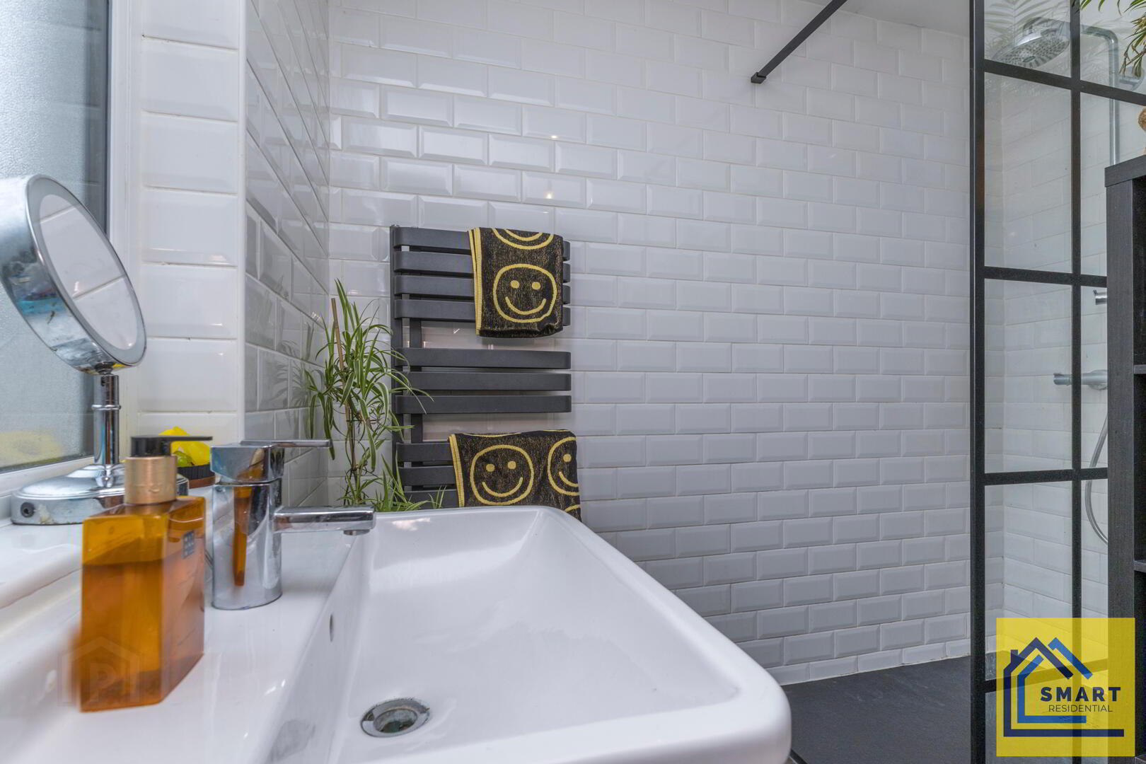 The shower room is tiled with white subway tiles and exposed brick feature wall and includes a WC, wash basin, and a walk-in shower enclosure with a modern chrome heated towel rail.