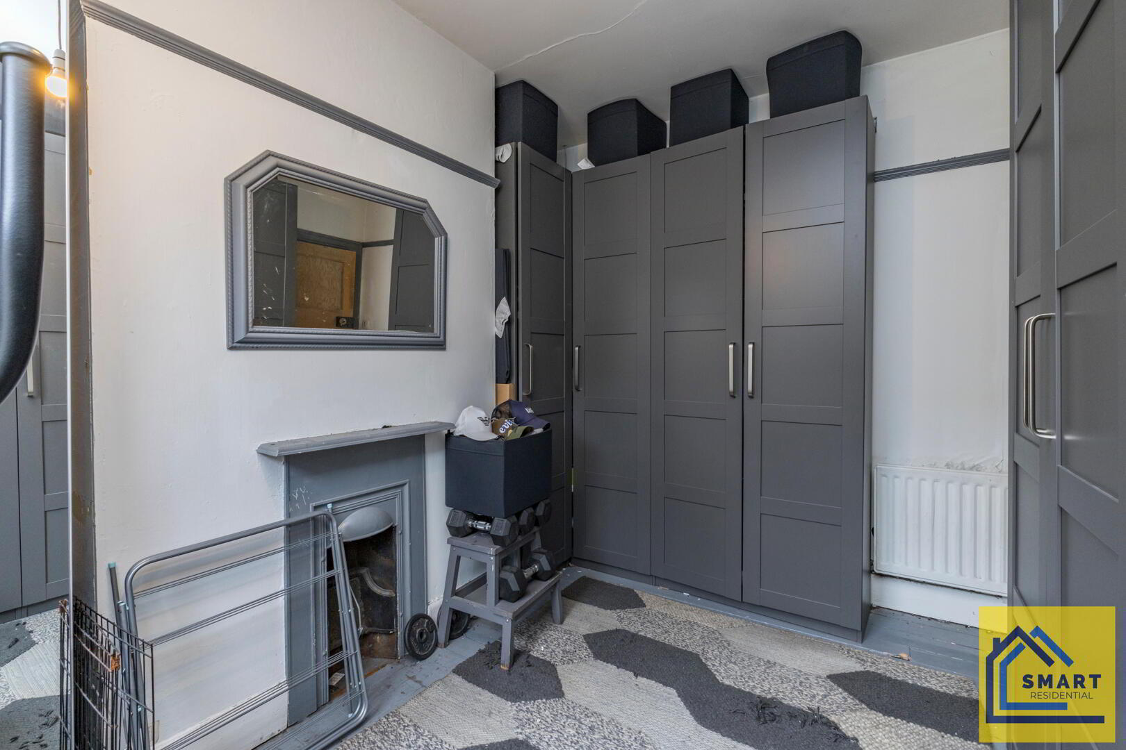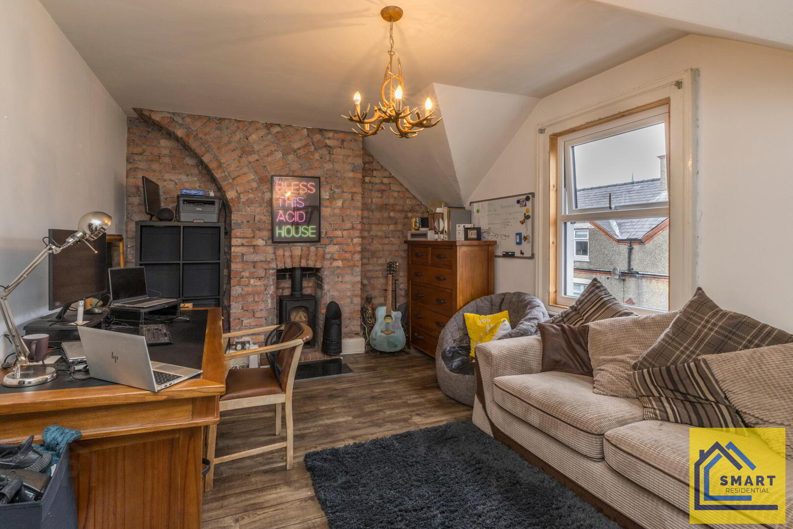 Bedroom 2 is a large room set on the top floor with wood-effect flooring and a traditional cast iron fireplace.