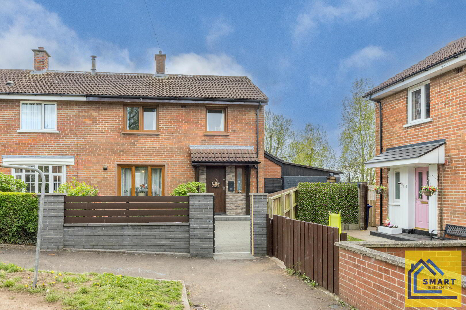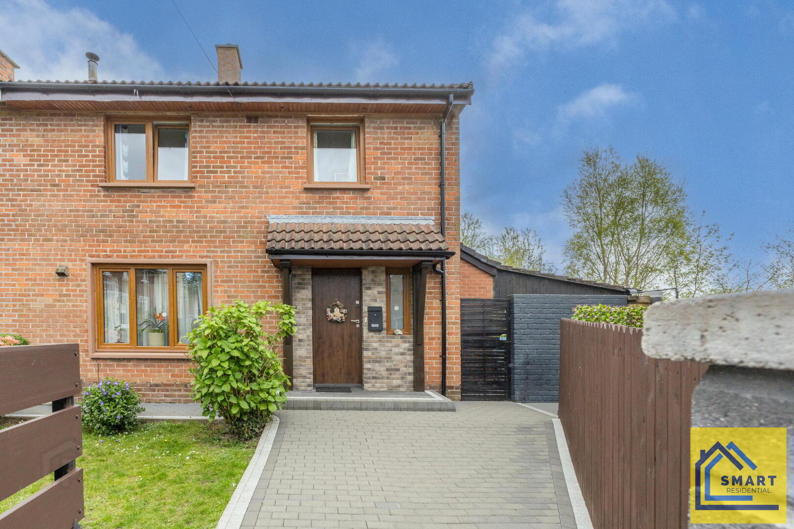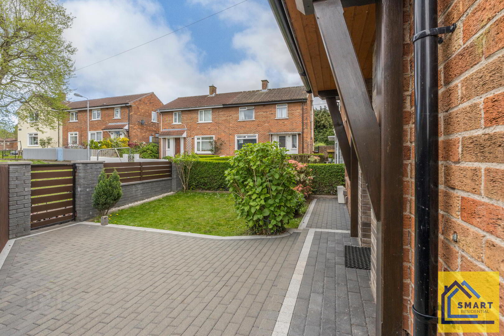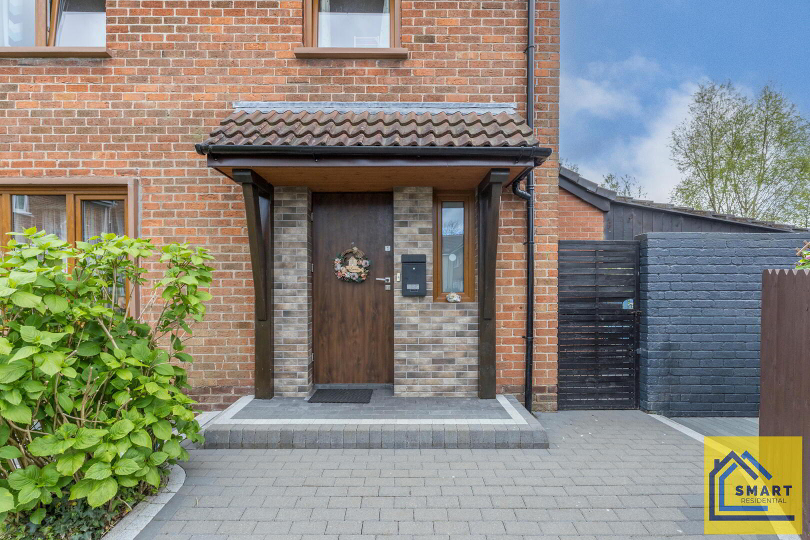 The front exterior of the property features a brick-built, semi-detached home with a covered porch set on an inviting paved driveway. The garden area includes a small lawn bordered neatly with shrubs and a gate providing access to the rear garden. The property has an attractive wooden front door with adjoining window, creating a welcoming first impression.