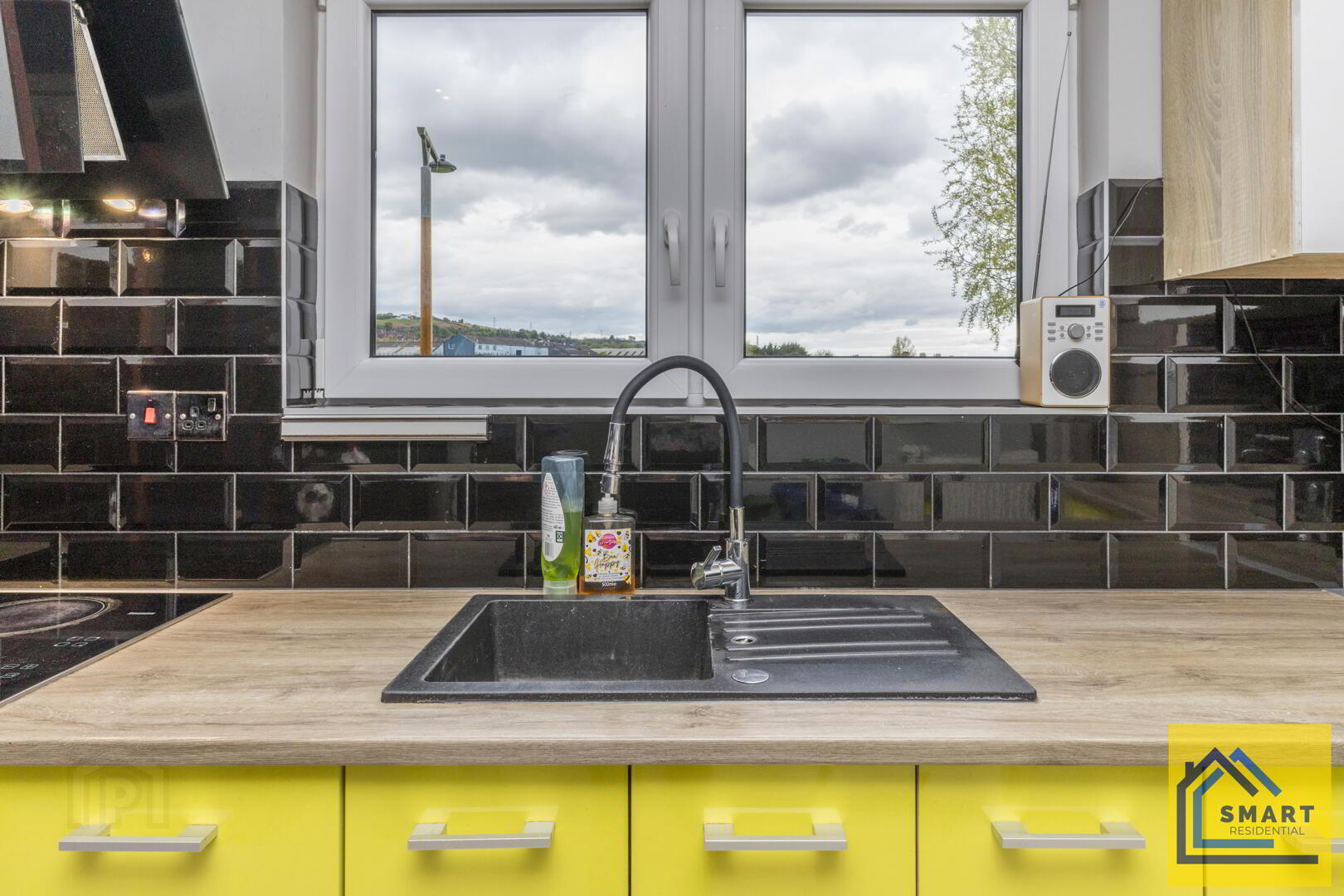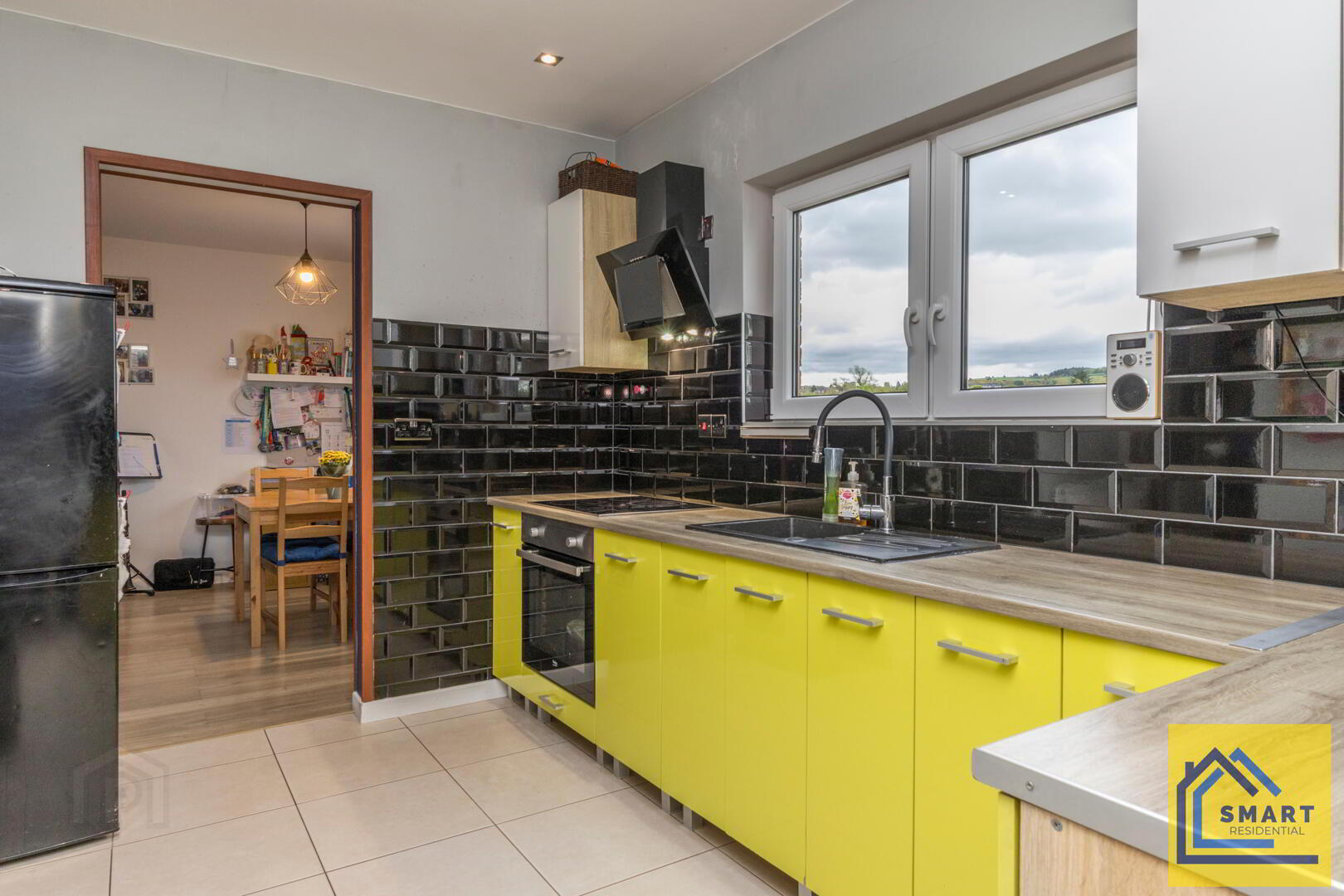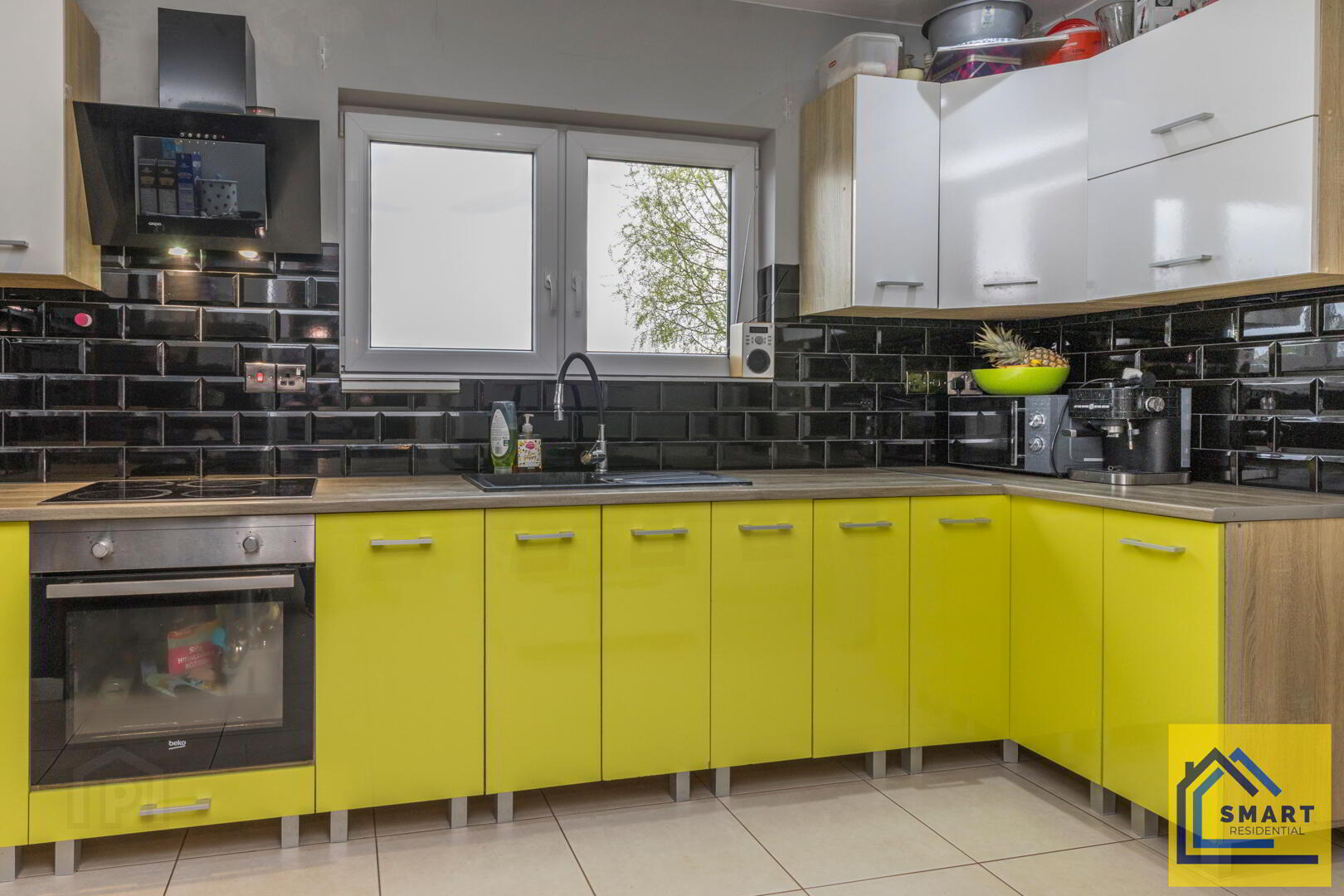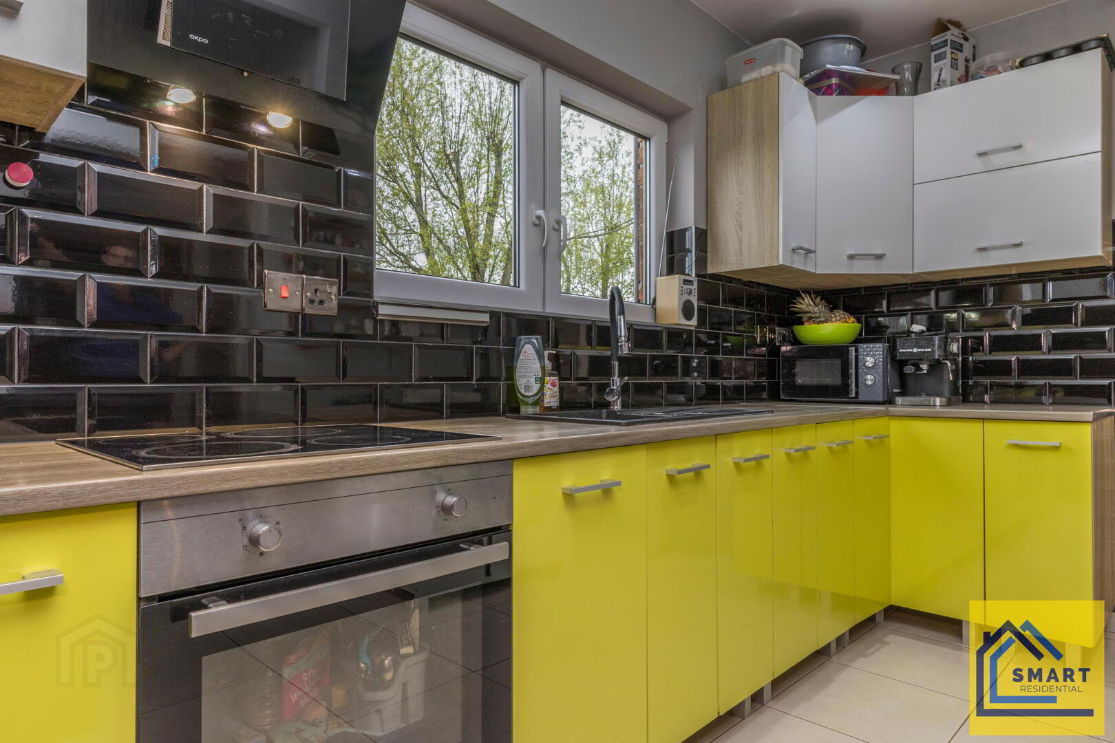 This kitchen is contemporary and practical, featuring striking green lower cabinets paired with white upper cupboards, offering plenty of storage. The work surfaces are wood-effect, complemented by glossy black subway tiled splashbacks. A window above the sink brings in natural light and provides views outside. The kitchen also includes a built-in oven with a hob and extractor fan, blending functionality and style.