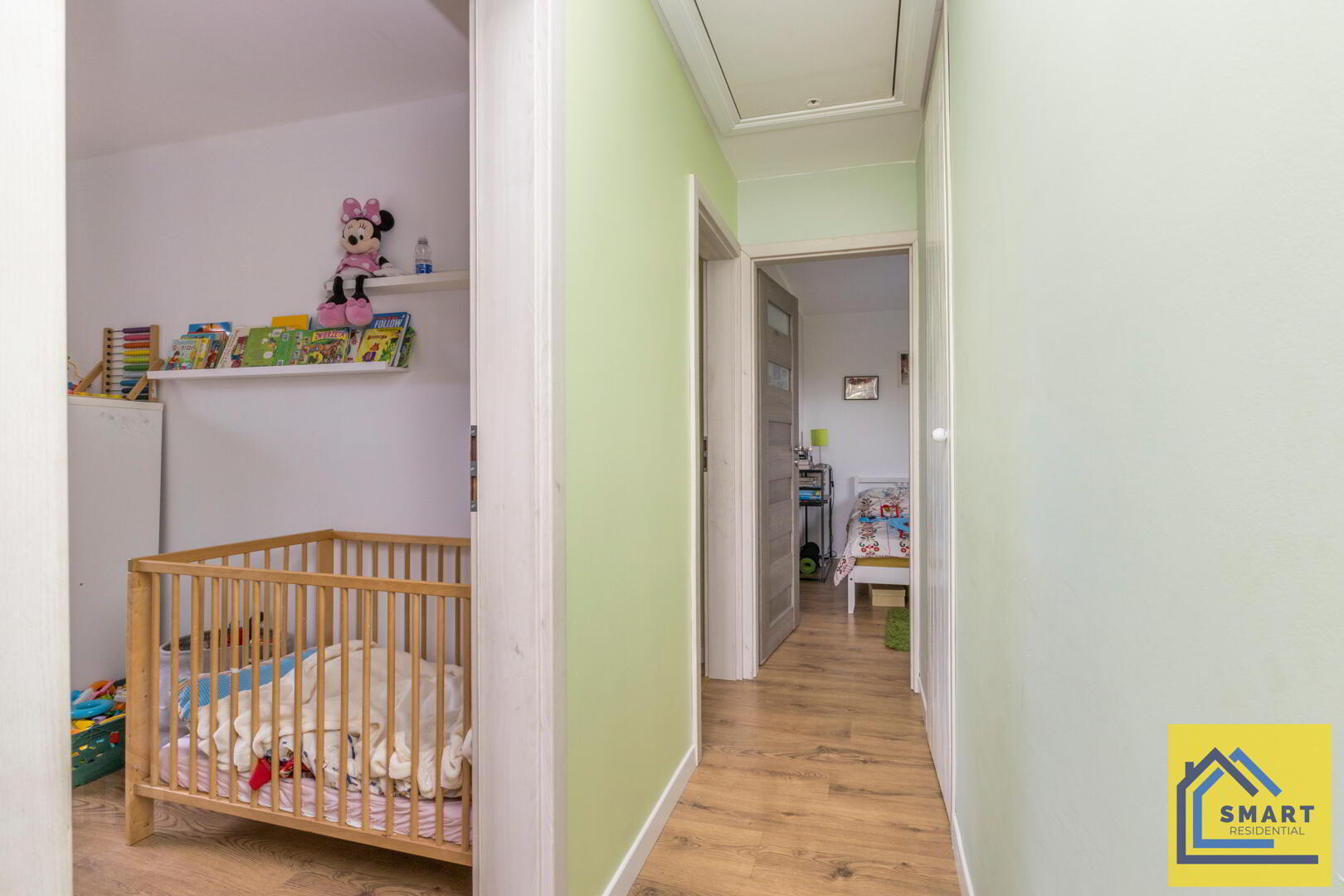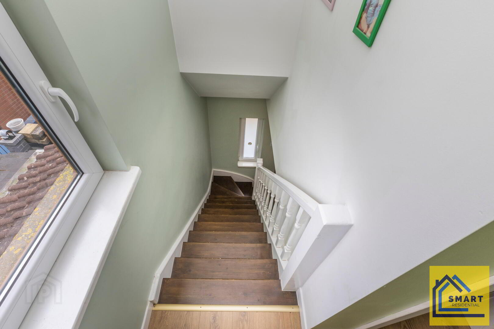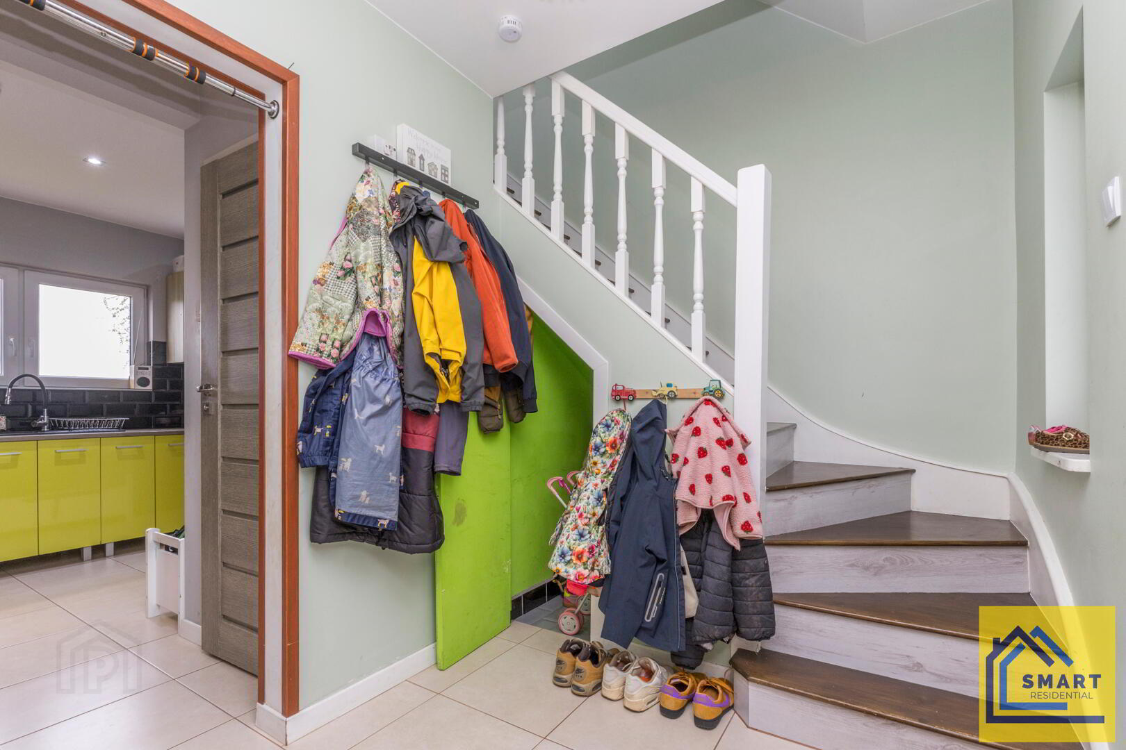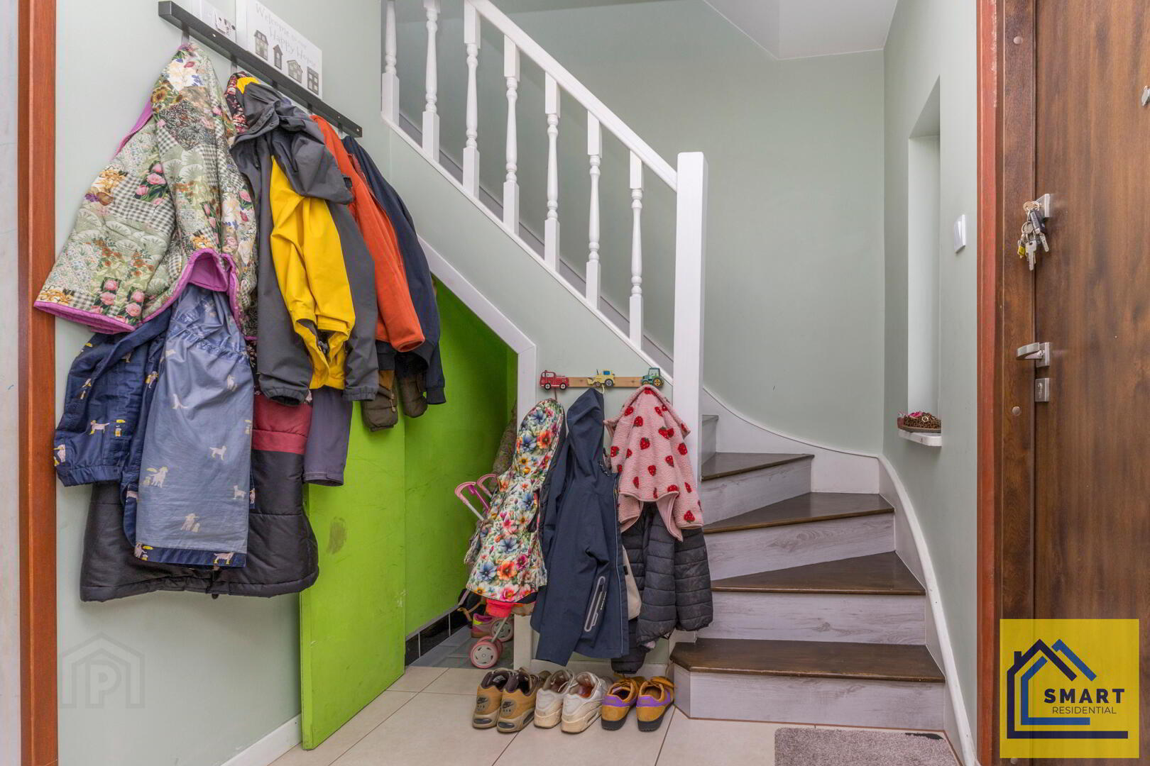 This welcoming hall features a staircase with white balustrades leading to the first floor. The walls are painted in a soft green shade, creating a fresh and inviting atmosphere. There is practical space for coats and shoes, making it a functional entrance to the home.