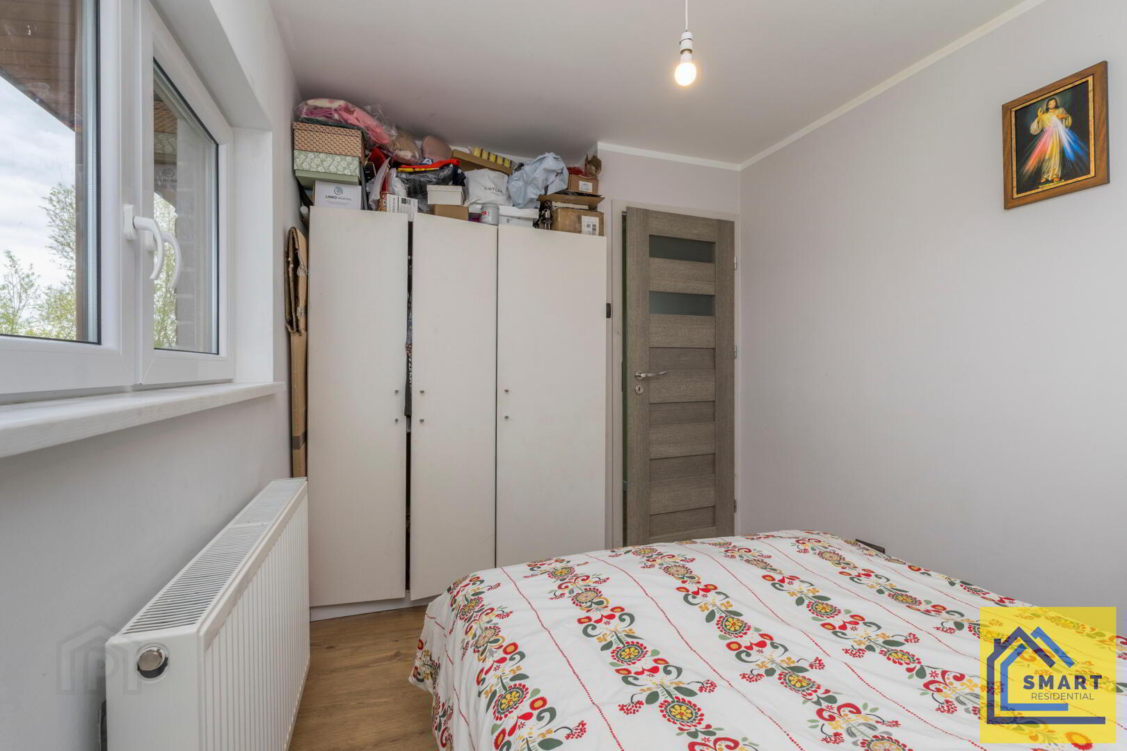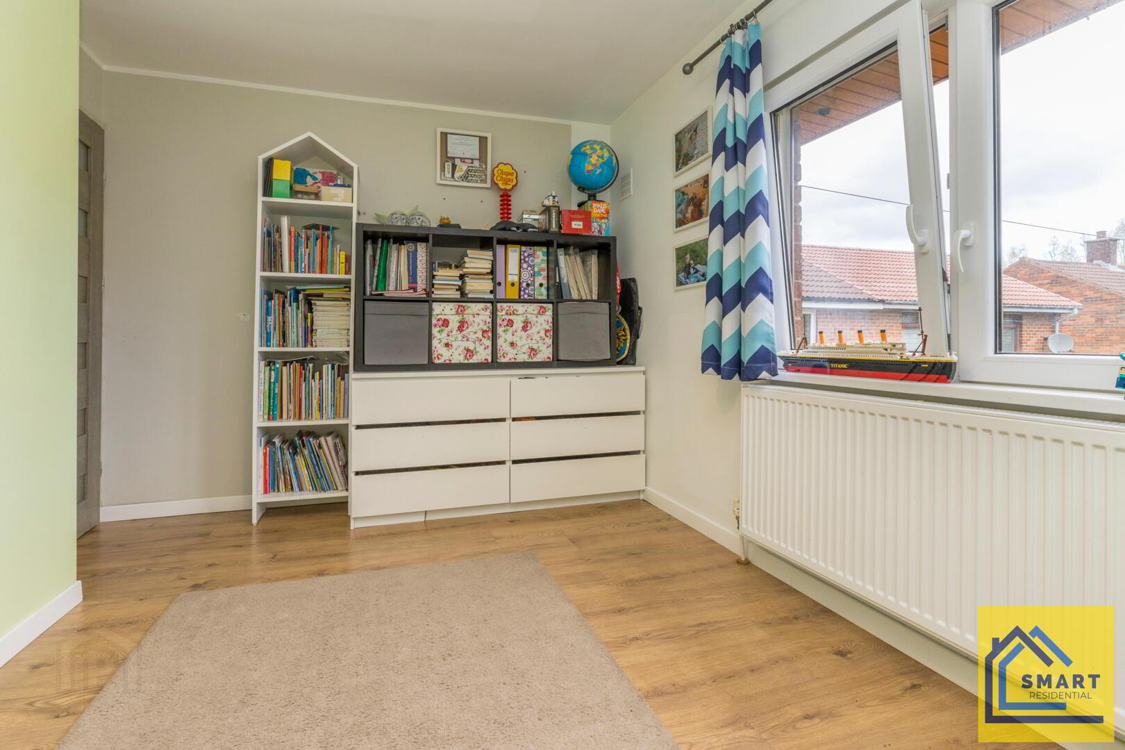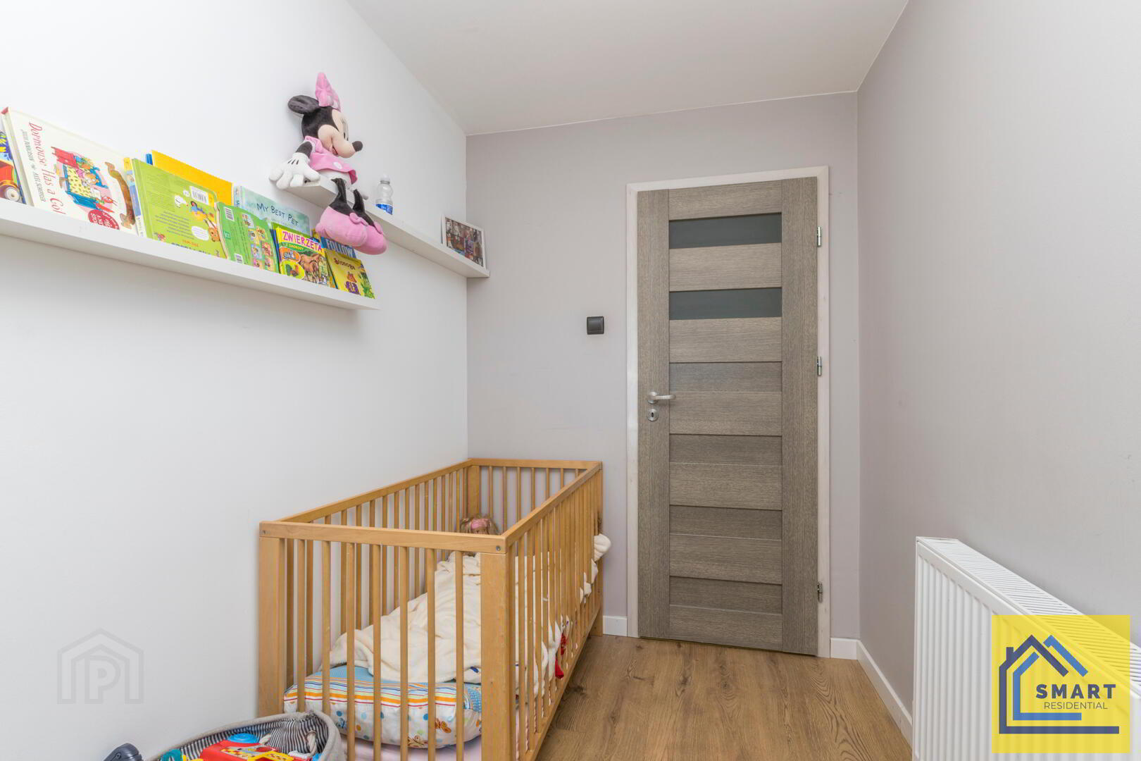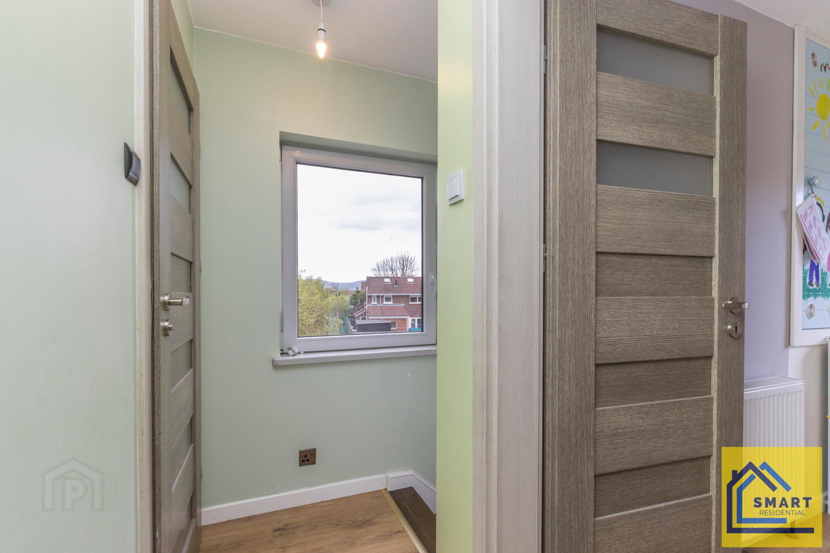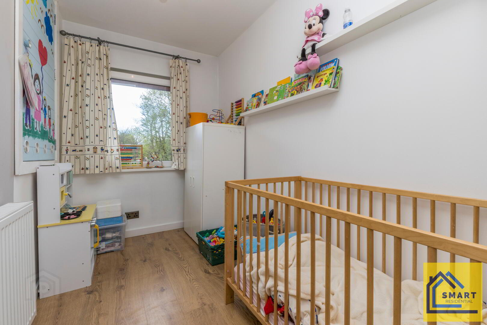Bedroom 3 is a smaller room, ideal for a nursery or study. It features wood flooring, a simple neutral colour scheme, and a window over the radiator that brings in natural light. The space is practical and easy to personalise.