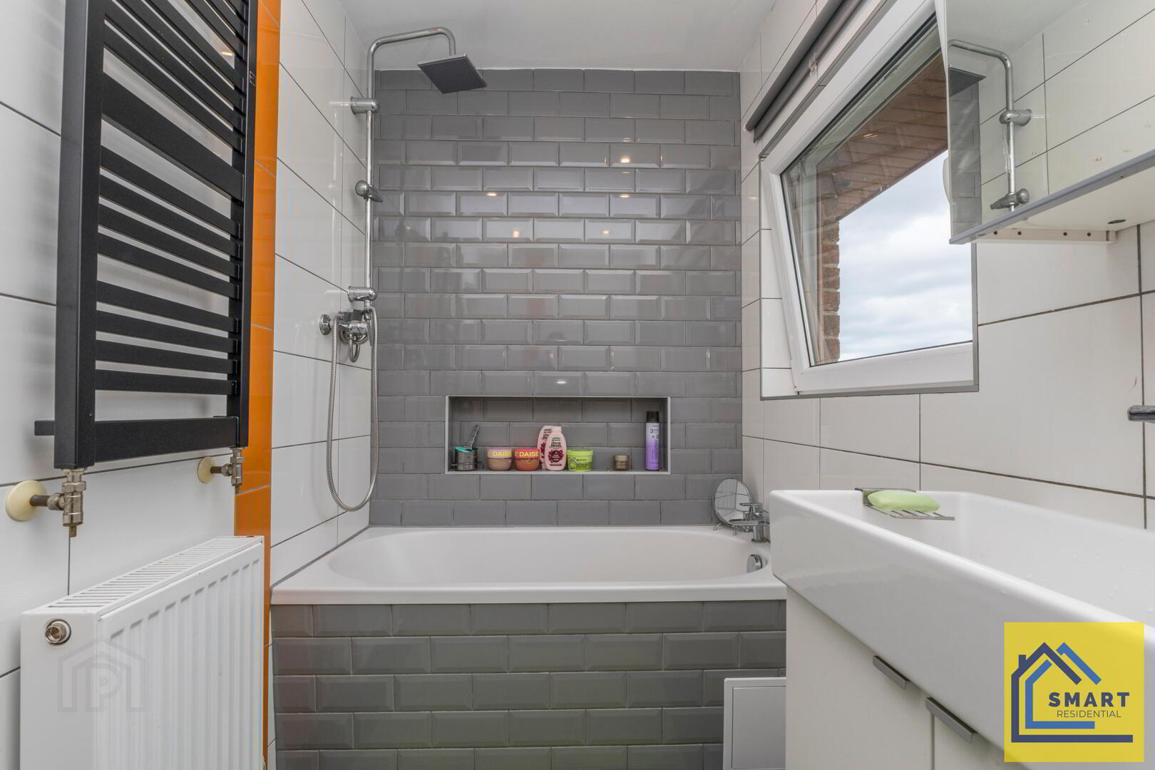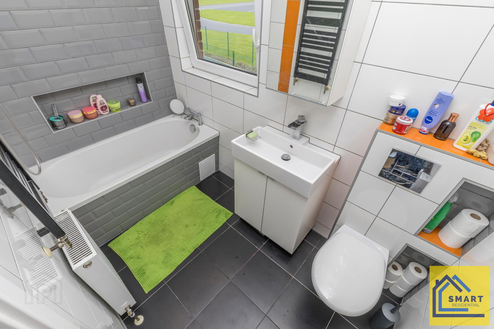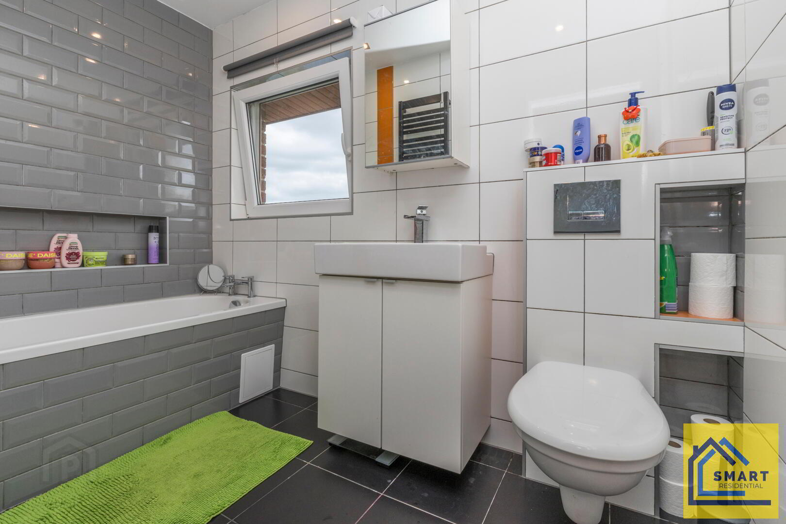 The family bathroom has a modern feel with a combination of white and grey tiling and a sleek black tiled floor. It includes a bathtub with a shower overhead, a contemporary basin with storage cabinet beneath, and a wall-mounted toilet. A window beside the bath allows natural light to brighten the space.