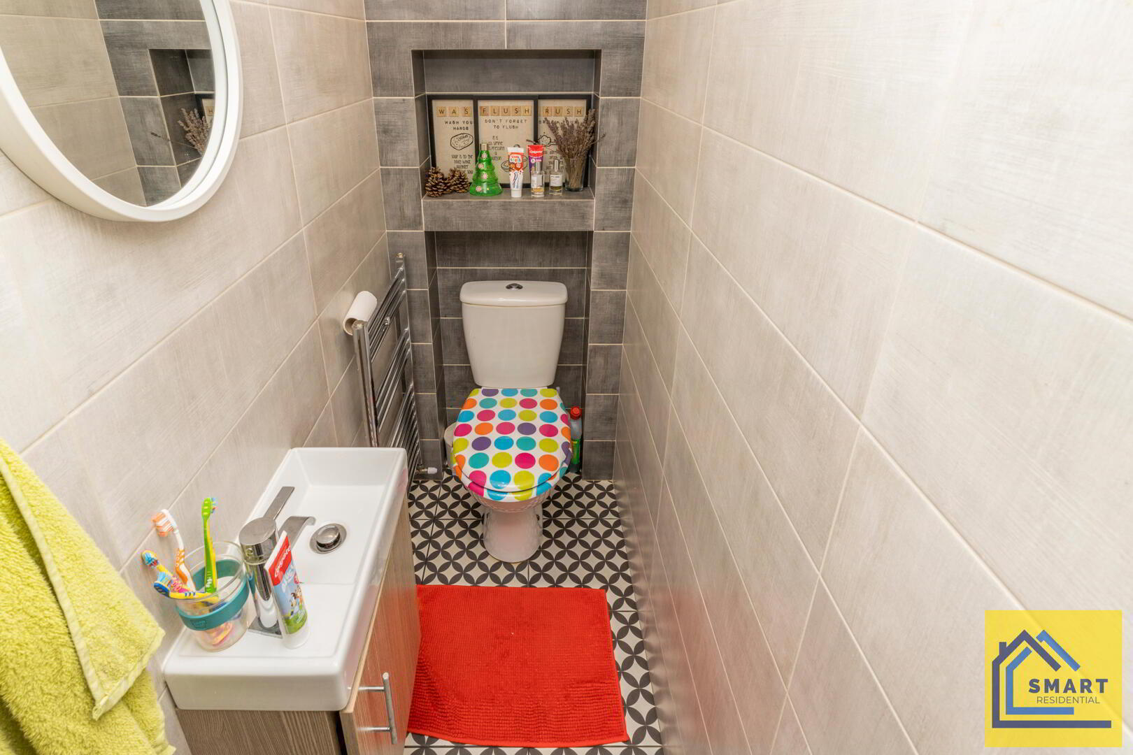 The ground floor cloakroom is stylishly tiled with a combination of grey and beige tiles, featuring a small modern sink and a toilet with a colourful seat cover. A niche above the toilet provides practical storage for toiletries.