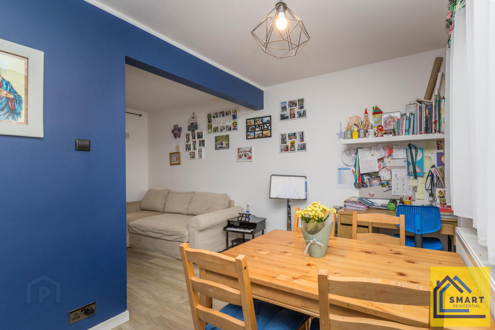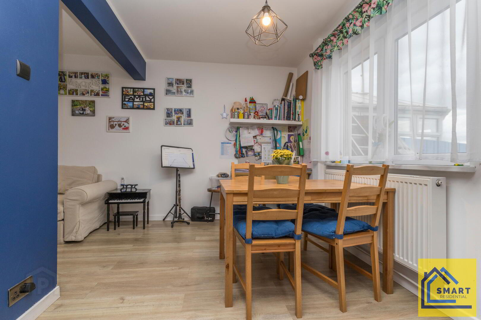 The open-plan living and dining area is bright and spacious, with natural light flooding in through large windows. Neutral walls and wood-effect flooring create a fresh, modern backdrop. The living area offers apace for a comfortable corner sofa, while the dining area provides ample space for a dining table and chairs. This versatile space is ideal for relaxing and entertaining.
