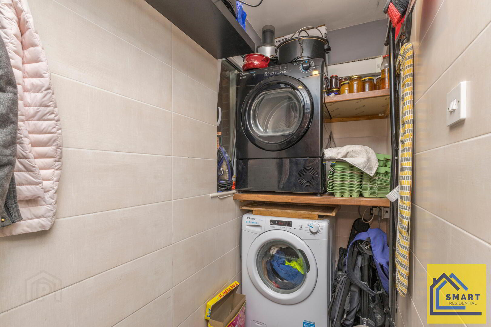 Adjacent to the kitchen, this compact utility room is fitted with tiled walls and houses space for a washer and dryer, along with shelving for storage. It is practical and neatly organised to support everyday household chores.
