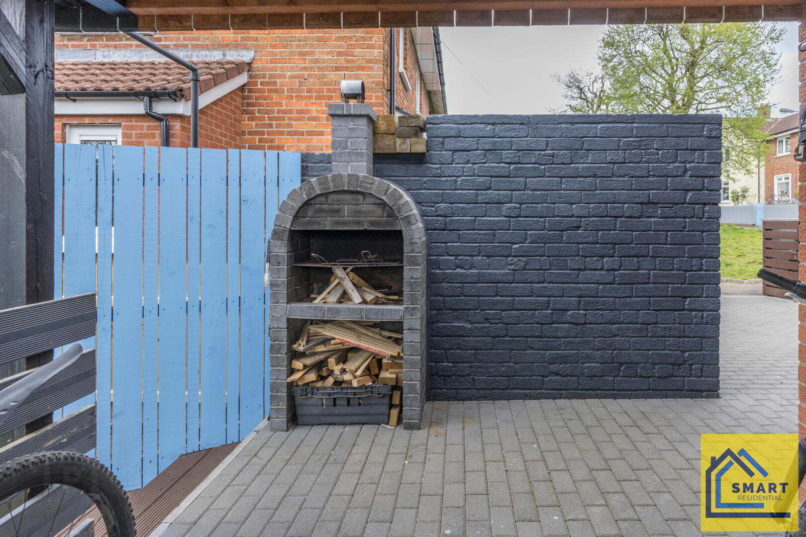 The rear garden is a generous outdoor space, mainly laid to lawn with a paved patio area perfect for outdoor seating or barbecues. There is a wooden shed for storage and a covered area with a brick-built wood store and barbecue, ideal for alfresco dining. The garden is enclosed by a painted wooden fence and framed by mature trees, offering a private and peaceful setting.