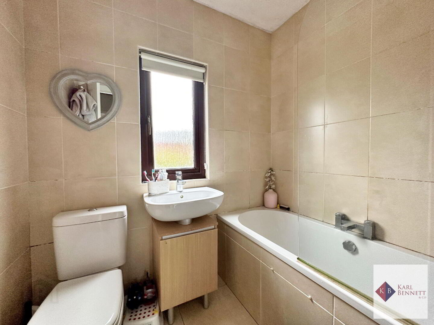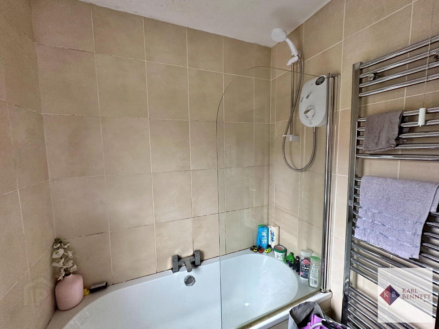 Three piece modern white suite comprising panelled bath with chrome taps. electric shower unit, glass shower screen. Pedestal wash hand basin. Low Flush WC. Fully tiled walls, tiled floor, chrome towel radiator.